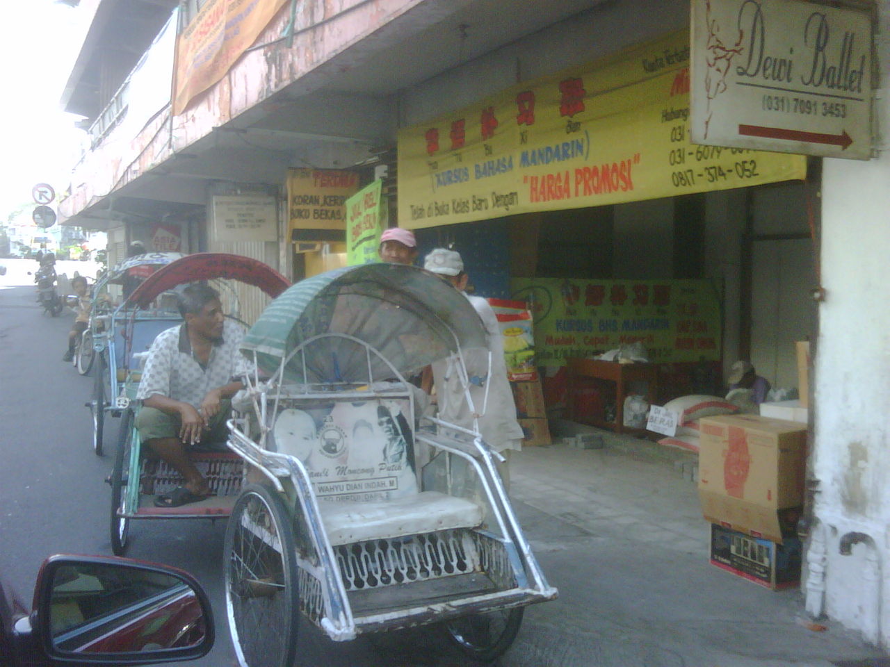 この人力車は東JAWAにあるもので、BECAKと言います。むかしからあるもので、最近はせいふの規制がきびしくなって、ドンドン少なくなって来ました。最高二人までしかのれなくて、ゆっくり走ってるけど、やっぱりこわいですね。でもそちらの地元の人はなれてます。とおさによって、値段はかわるけど五千ルピアからスタートです。