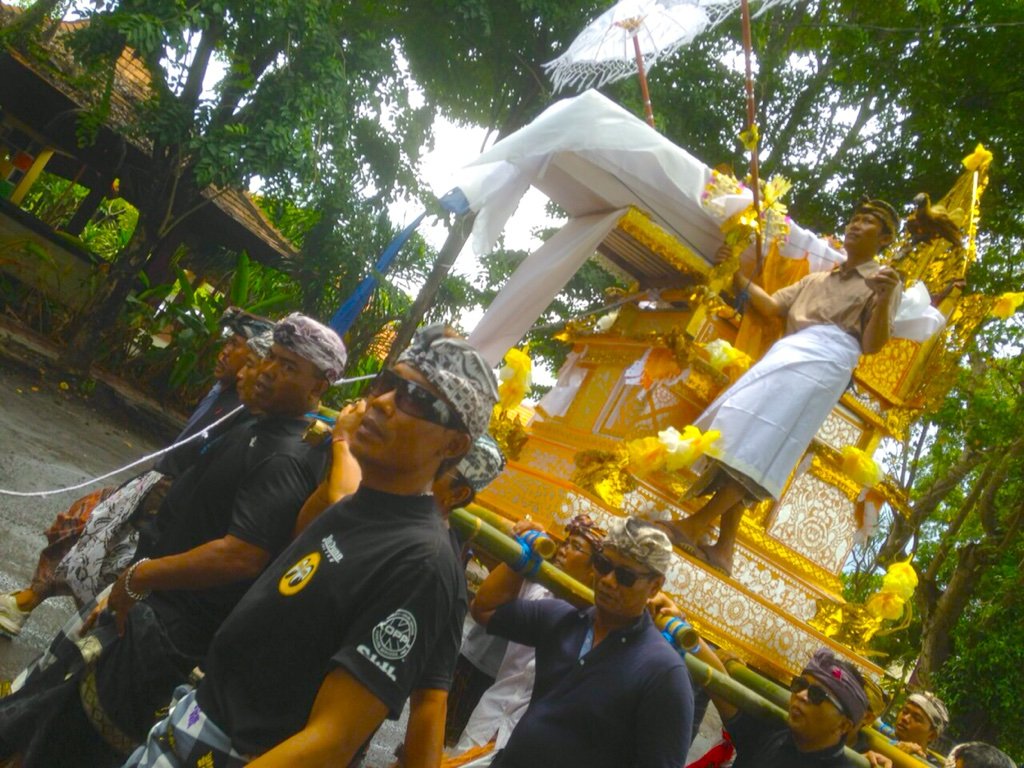 バリ島サーフィンキナ、今日は日本のおとうとのゆうま君とバリヒンズのお葬式に出ました。日本とバリ島の文化の違いでびっくり‼︎ 今日は雨の後でそんなに暑くなくてラッキー!これからビーチがわで燃やして、灰になった物を流して、かわりに海の水を持ち帰り、家のお寺のご先祖様の所におき、毎日お供え物、お祈りします!