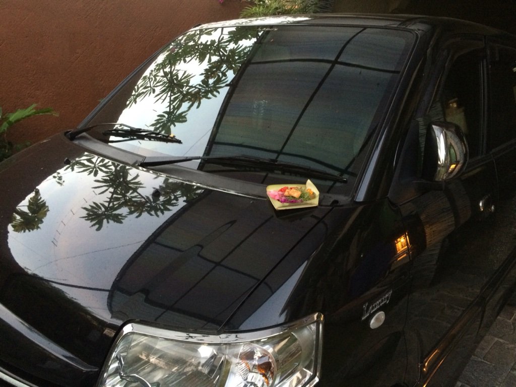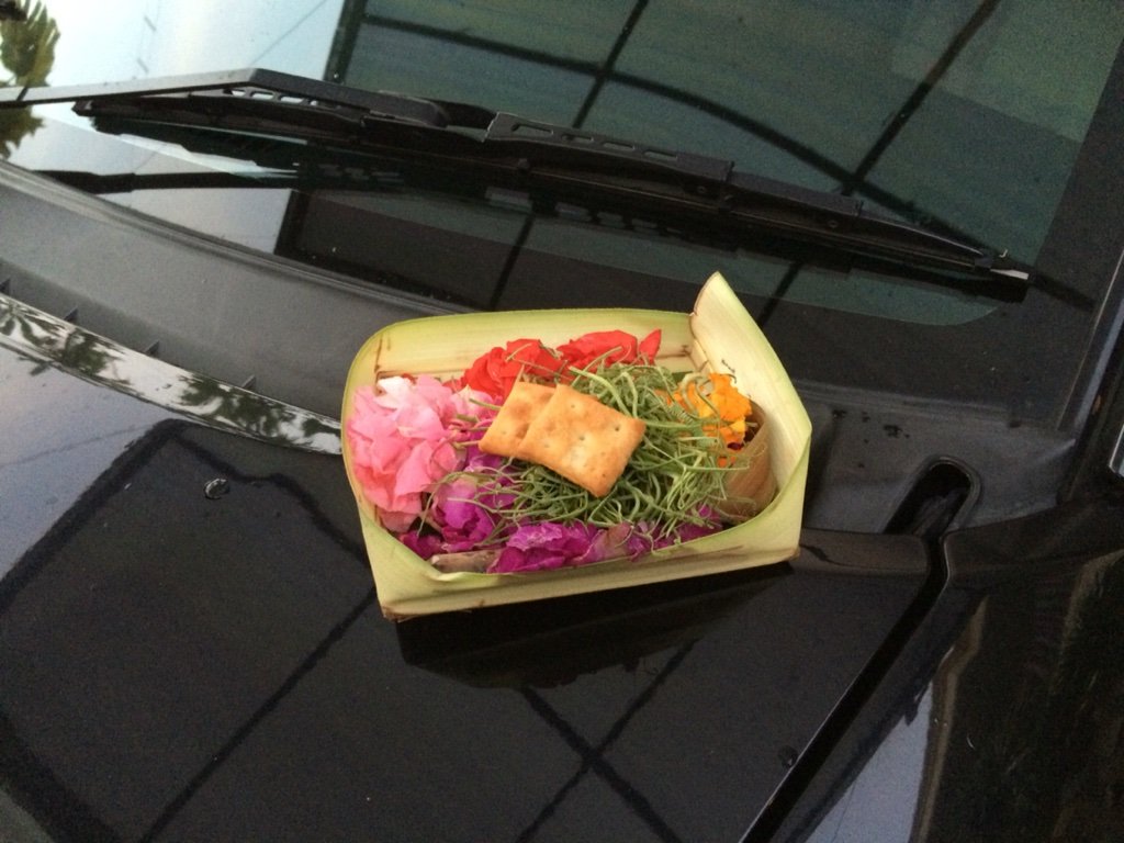 バリ島サーフィンキナ、毎日車の方にお供え物をかみさまにあげています。あんぜんのためです〜!